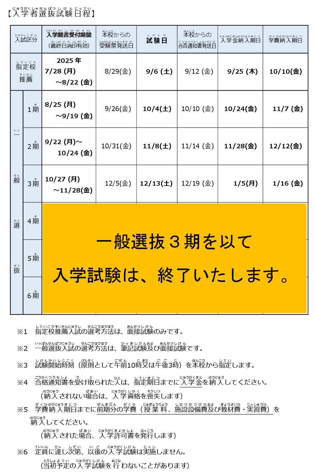 なお、一般選抜入試4期以後の入試は、定員に達し次第実施しません。(当初予定の入試を行わないことがあります。)
